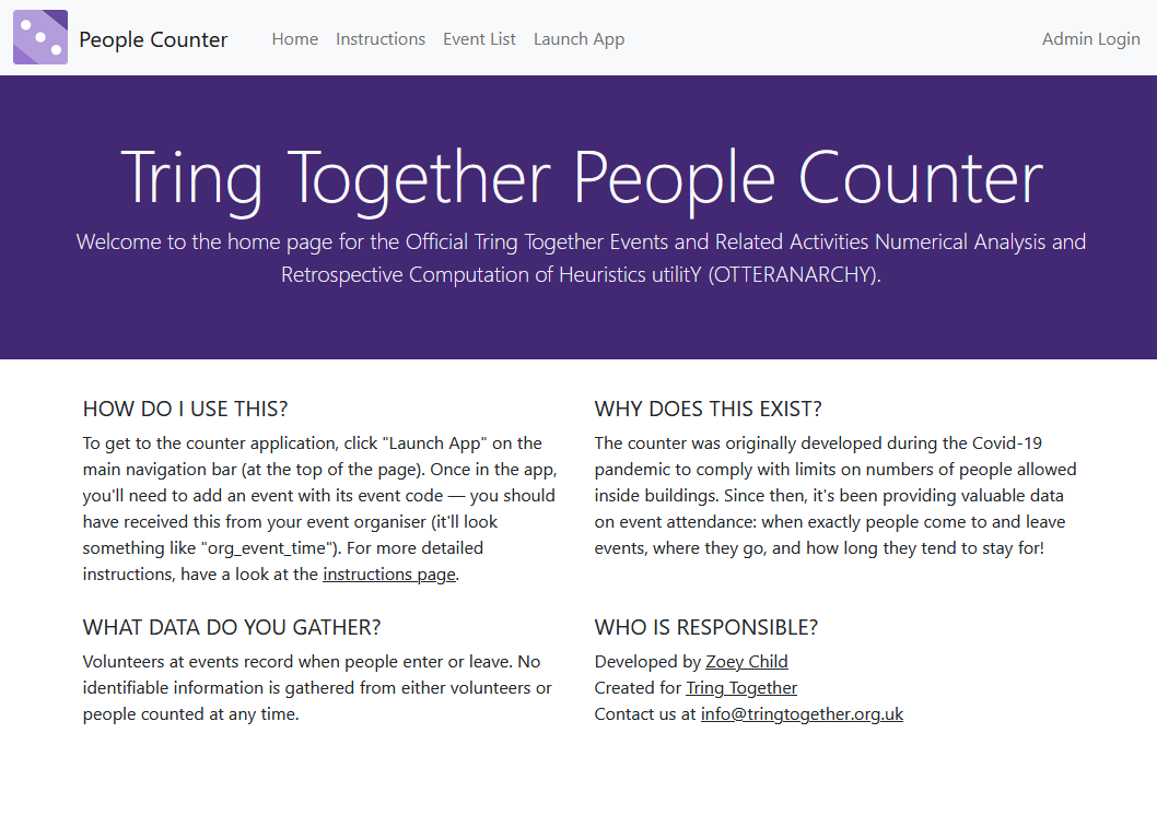 Following on from the Tring Together People Counter, the charity wanted a way for staff to manage the event details without having to go through me. We also decided to switch to a self-hosted model for the server rather than relying on Google after one event pushed us over the usage limit for our tier and the app stopped working mid-event.