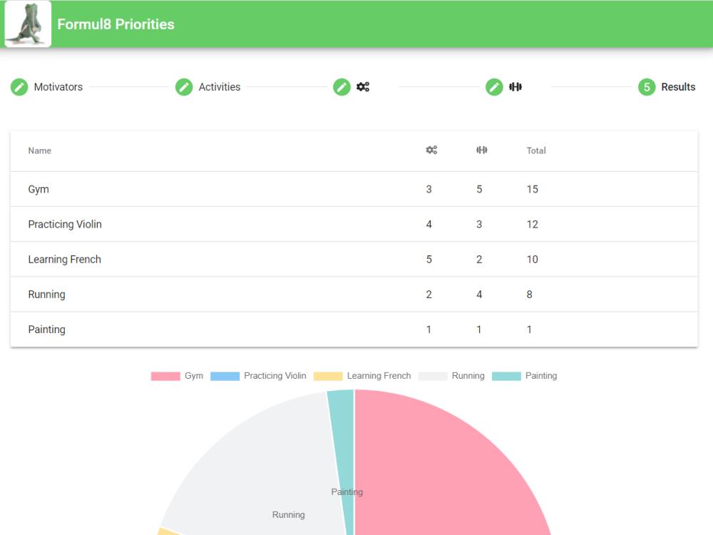 Formul8 is an app to help you organise your priorities in life. Clients select two “key factors” to rate their commitments on. A coordinator can use the resulting table and pie chart to help work through which commitments get them closer to achieving their goals and which might not be as productive.